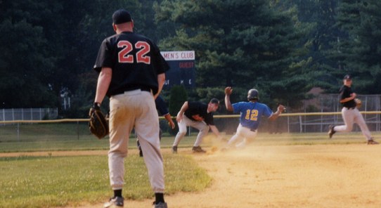 Matt Longo slaps on the tag as Brett Young (22) and Ian Wallace watch.
