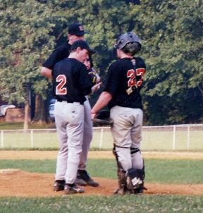 Bill Kohut (2) gets together with catcher Rob Oryl and pitcher Rob Schork for a meeting at the mound.